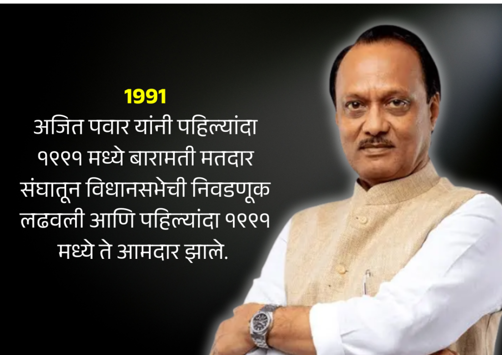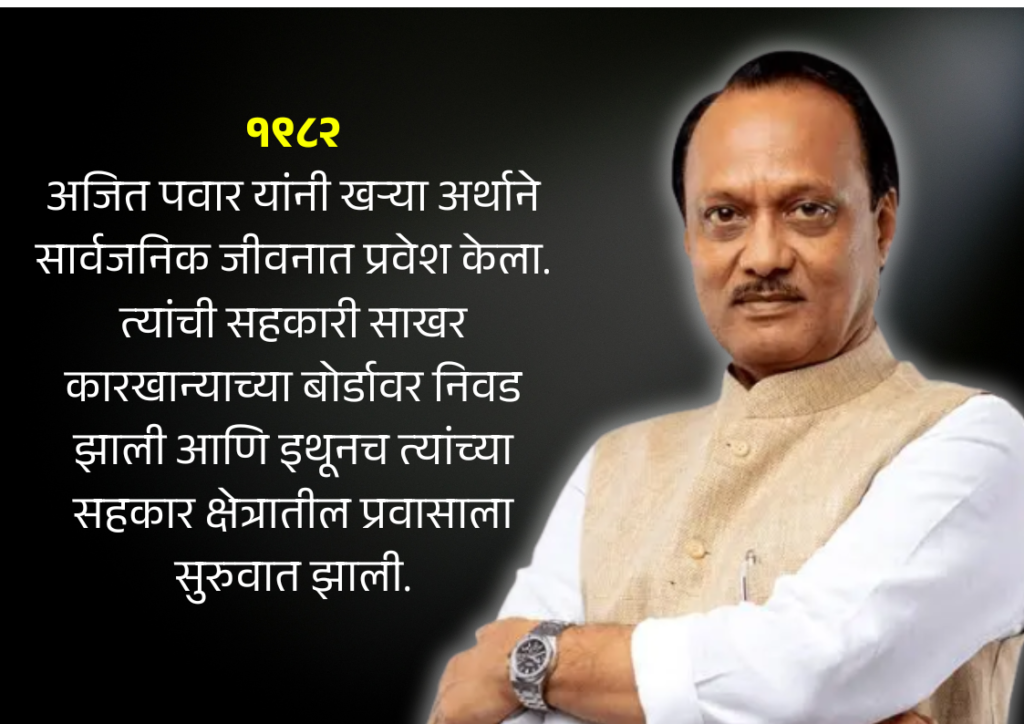 खऱ्या अर्थाने अजित पवार यांच्या राजकारणाची सुरुवात १९८२ मध्ये सहकारी संघटनेच्या माध्यमातून झाली. त्या काळात त्यांनी सहकारी साखर कारखान्यांमध्ये नेतृत्व केले आणि बारामती व परिसरातील विकासकामात भाग घेतला. अजित पवार यांनी पहिल्यांदा १९९१ मध्ये बारामती मतदार संघातून विधानसभेची निवडणूक लढवली आणि पहिल्यांदा १९९१ मध्ये ते आमदार झाले.